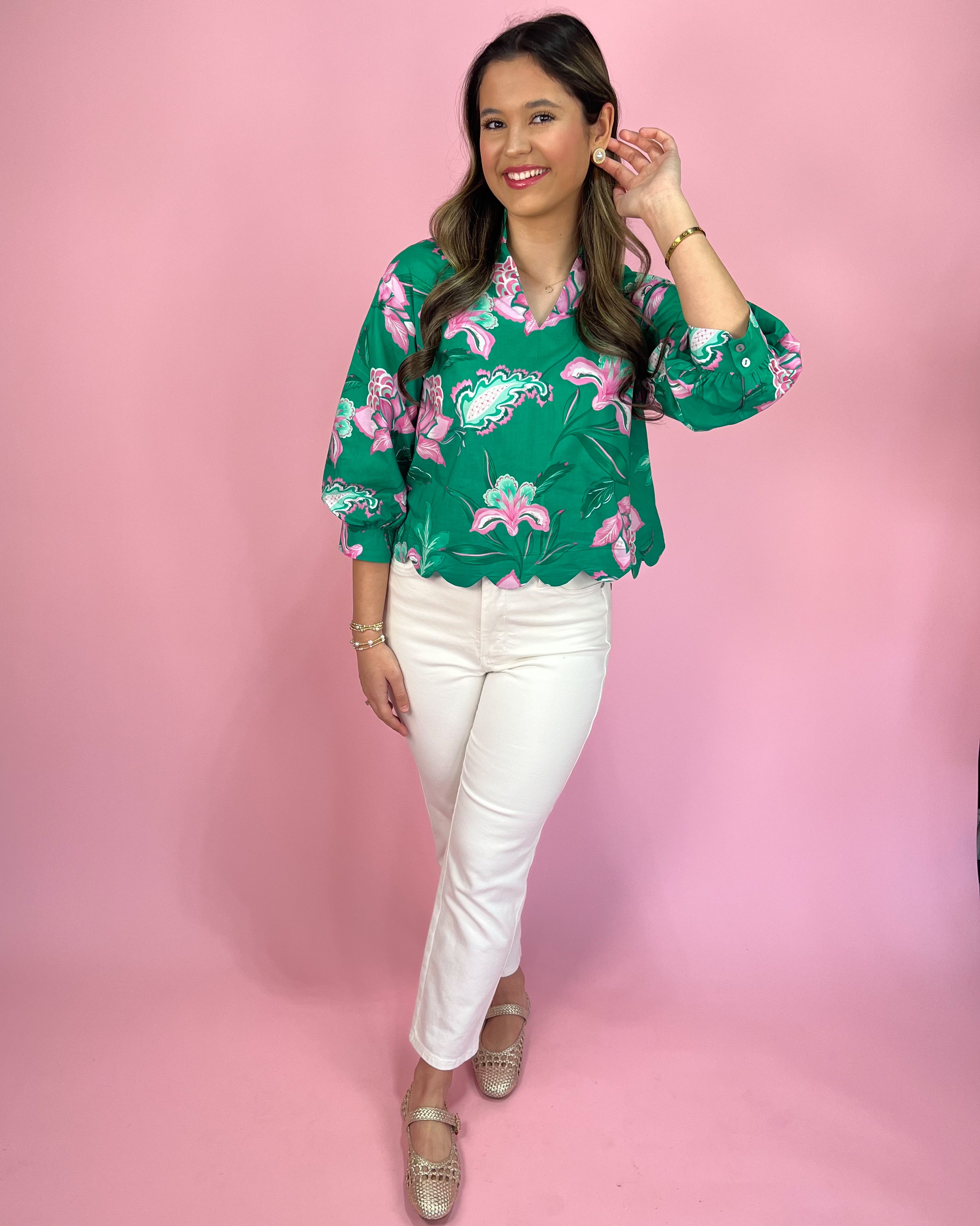 Designed with an easy, breezy silhouette, this top features soft volume through the sleeves and body for that effortlessly chic look we love. The lightweight cotton feel keeps it comfy, while the eye-catching print brings instant personality to any outfit. 💃💚