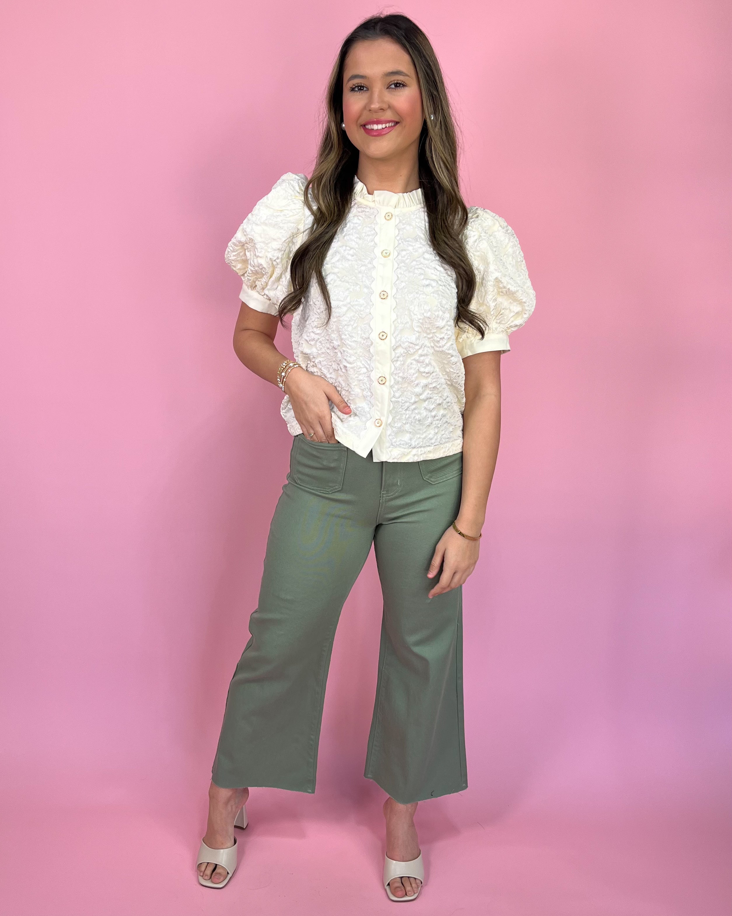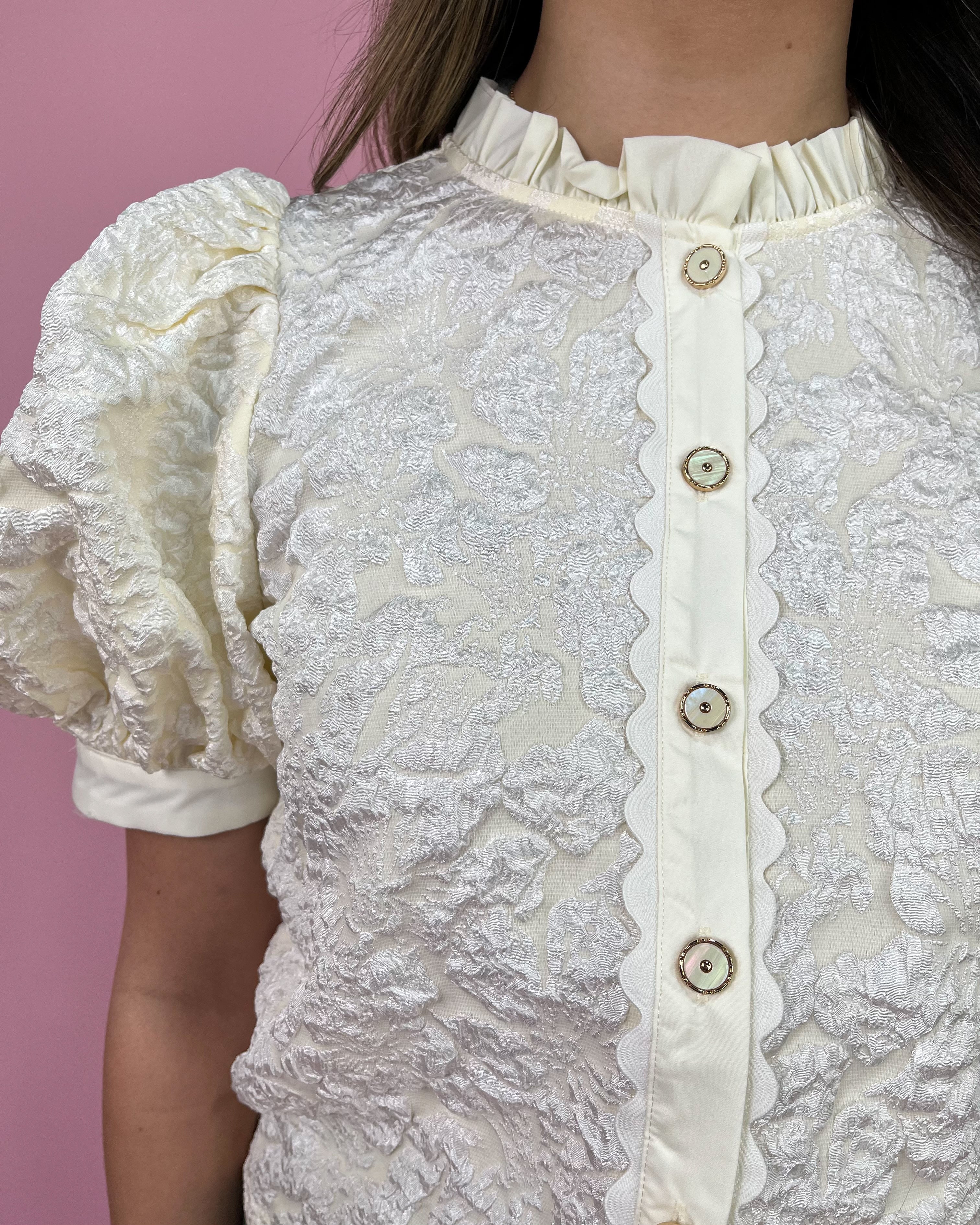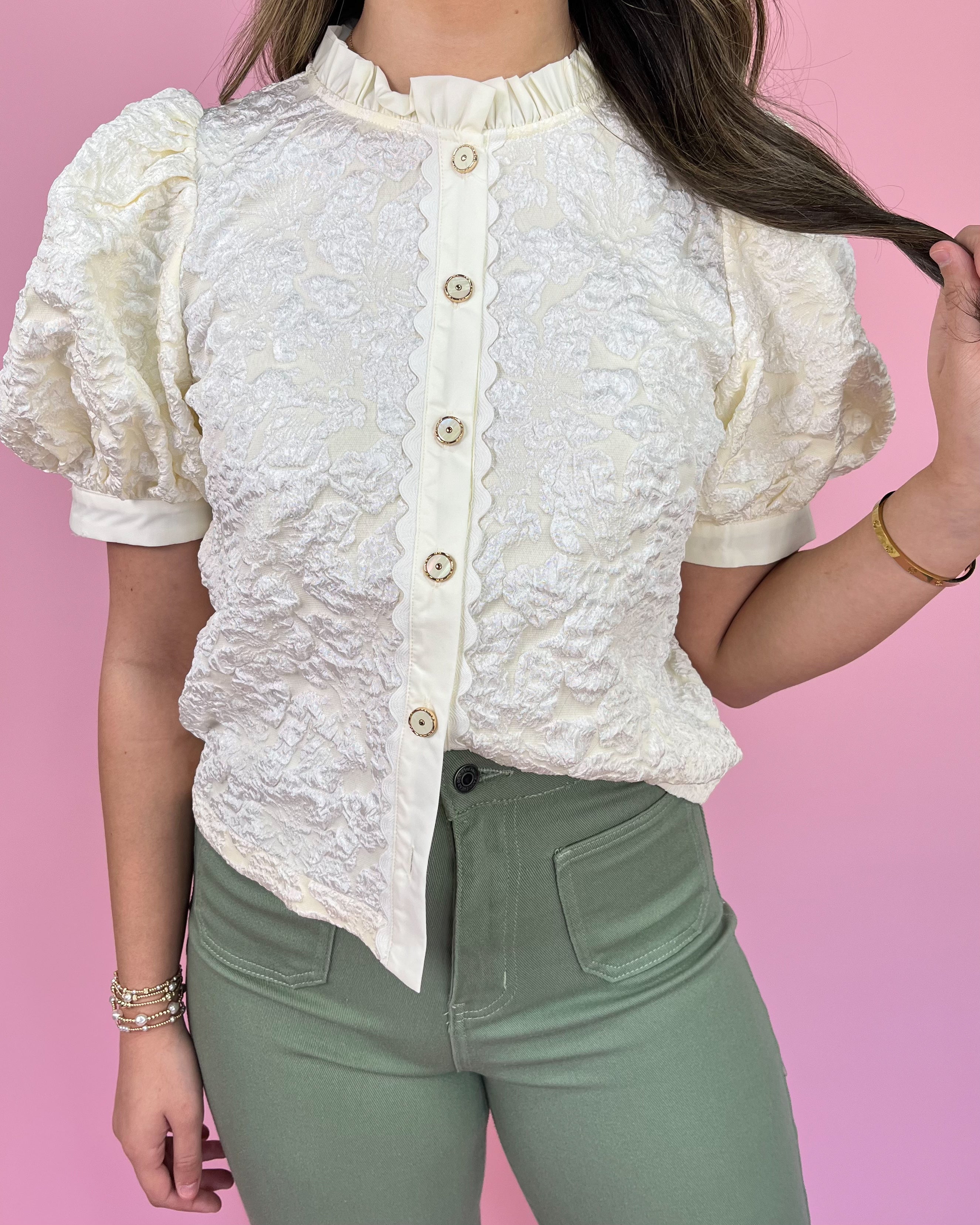 ✨🌸 Meet the Ivory Elegance Puff Sleeve Top — your new statement piece for brunches, bridal showers, or any moment that calls for timeless sophistication. With its textured floral fabric and luxurious sheen, this top blends classic charm with modern femininity for a look that’s effortlessly polished.
