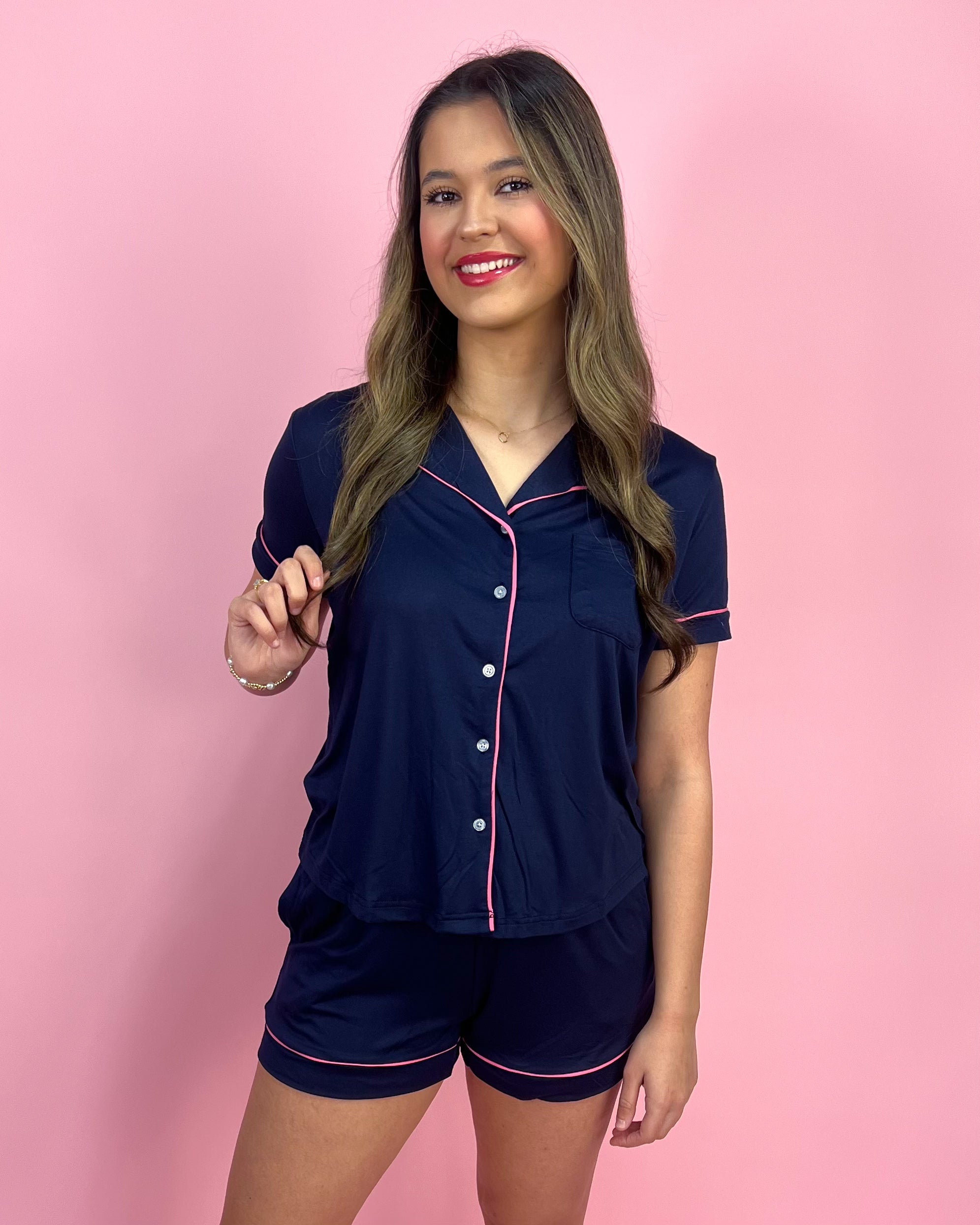 Cozy nights just got cuter 💙 This navy pajama set is the definition of comfy-chic with the sweetest pink piping details for that classic, put-together pajama look. It’s simple, timeless, and perfect for lounging around the house while still feeling adorable.