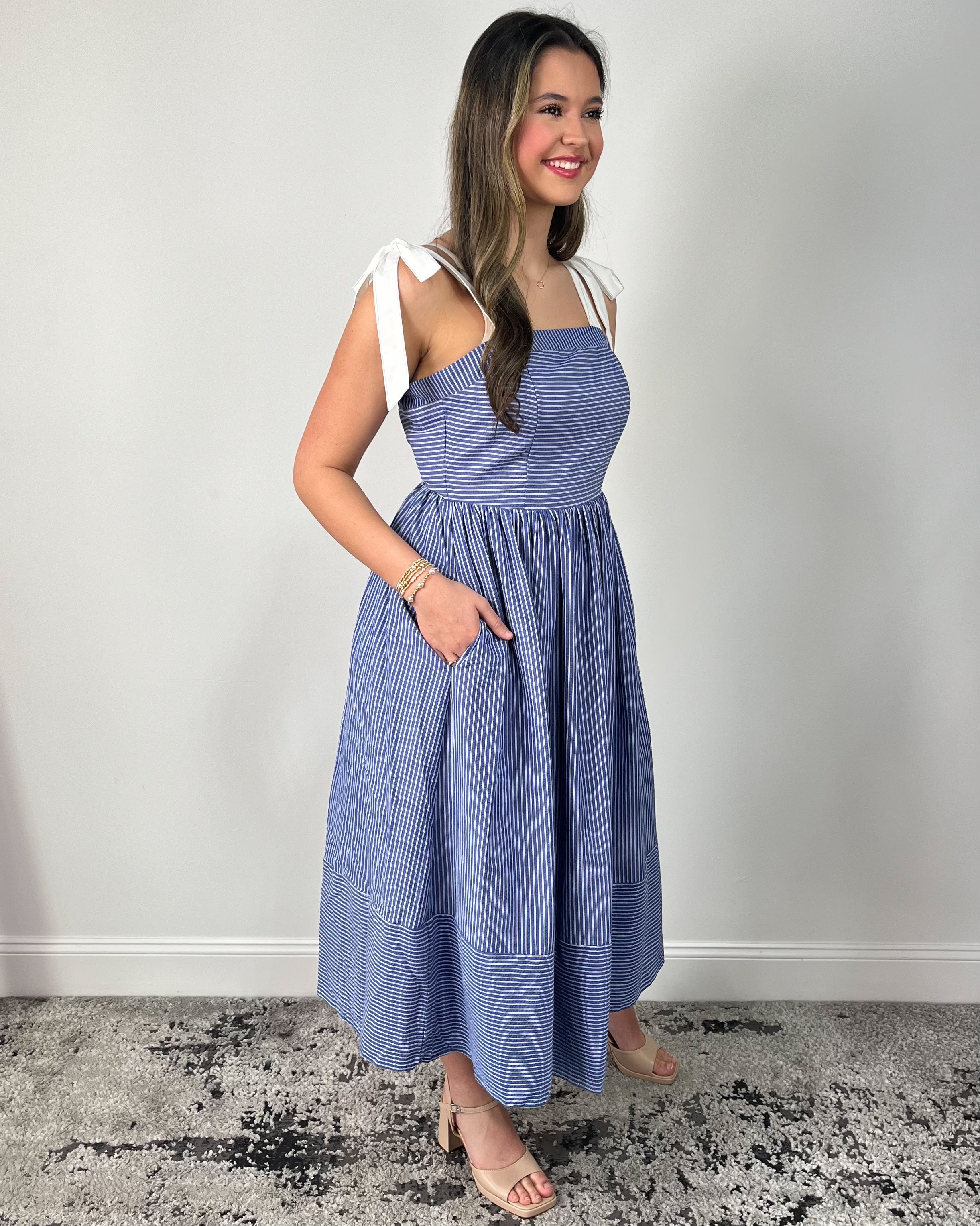 Meet the Sweet Stripes Midi Dress — a dreamy blend of effortless charm and classic stripes that feels like sunshine on a breezy day ☀️💙. This midi is designed with soft blue-and-white striping and pretty tie-shoulder straps that add the sweetest touch of femininity. Whether you're strolling downtown, heading to brunch, or dressing up for a warm-weather event, this beauty brings a timeless silhouette with a playful twist.