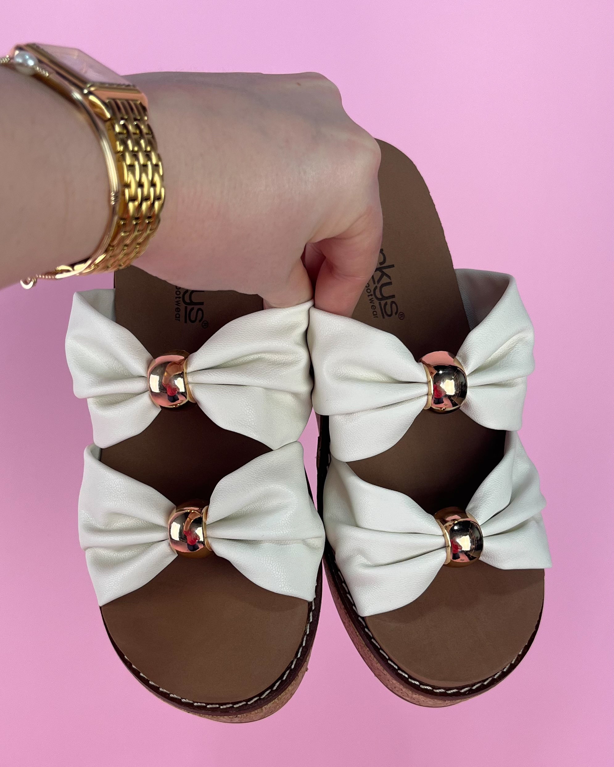 Meet your new sweet-but-stylish statement sandal — feminine, comfy, and effortlessly elevated. This cork platform slide features soft white bow detailing finished with a chic metallic accent that instantly gives boutique vibes. The cushioned footbed and lightweight cork sole make these perfect for all-day wear, while the platform adds just the right amount of height without feeling heavy.