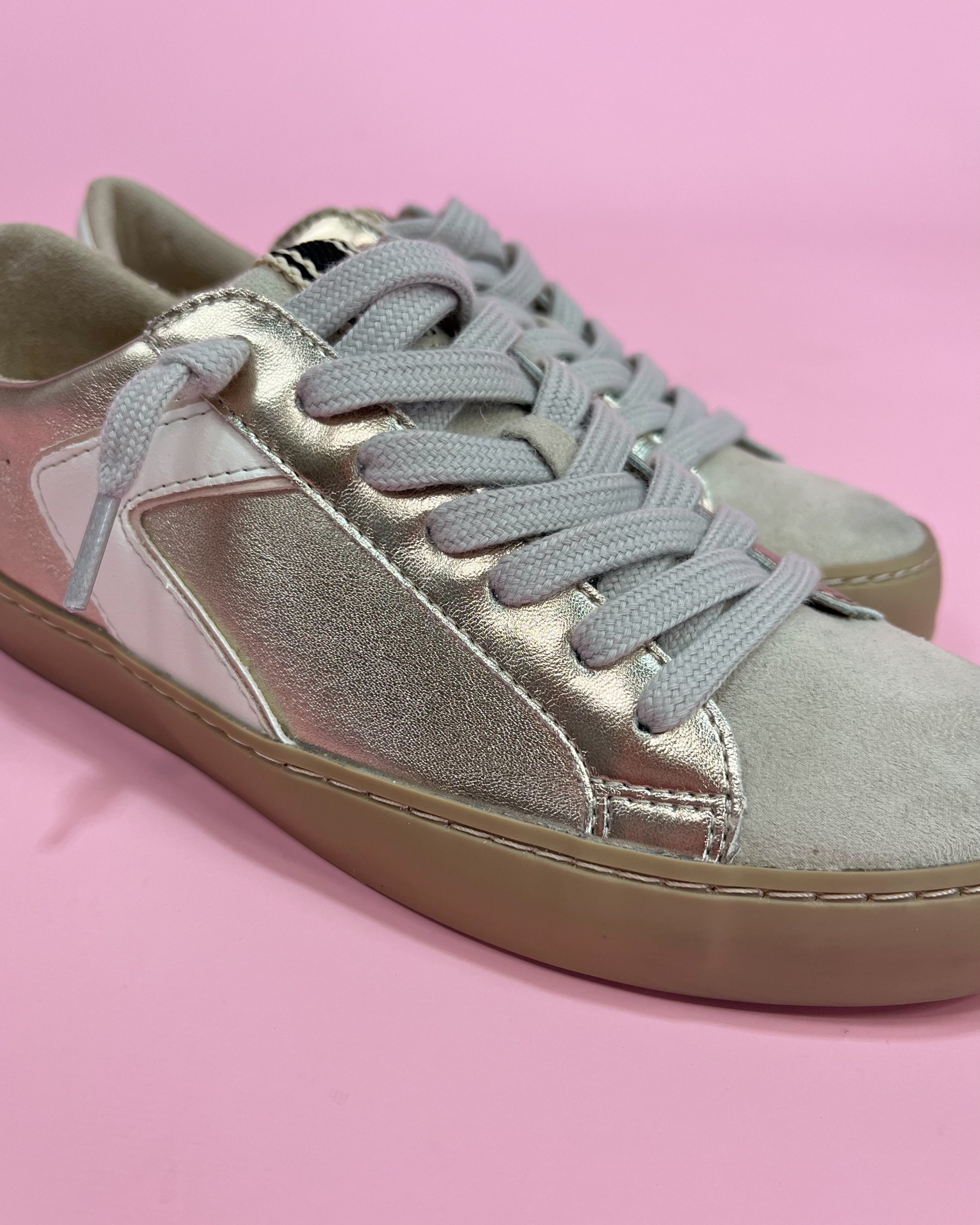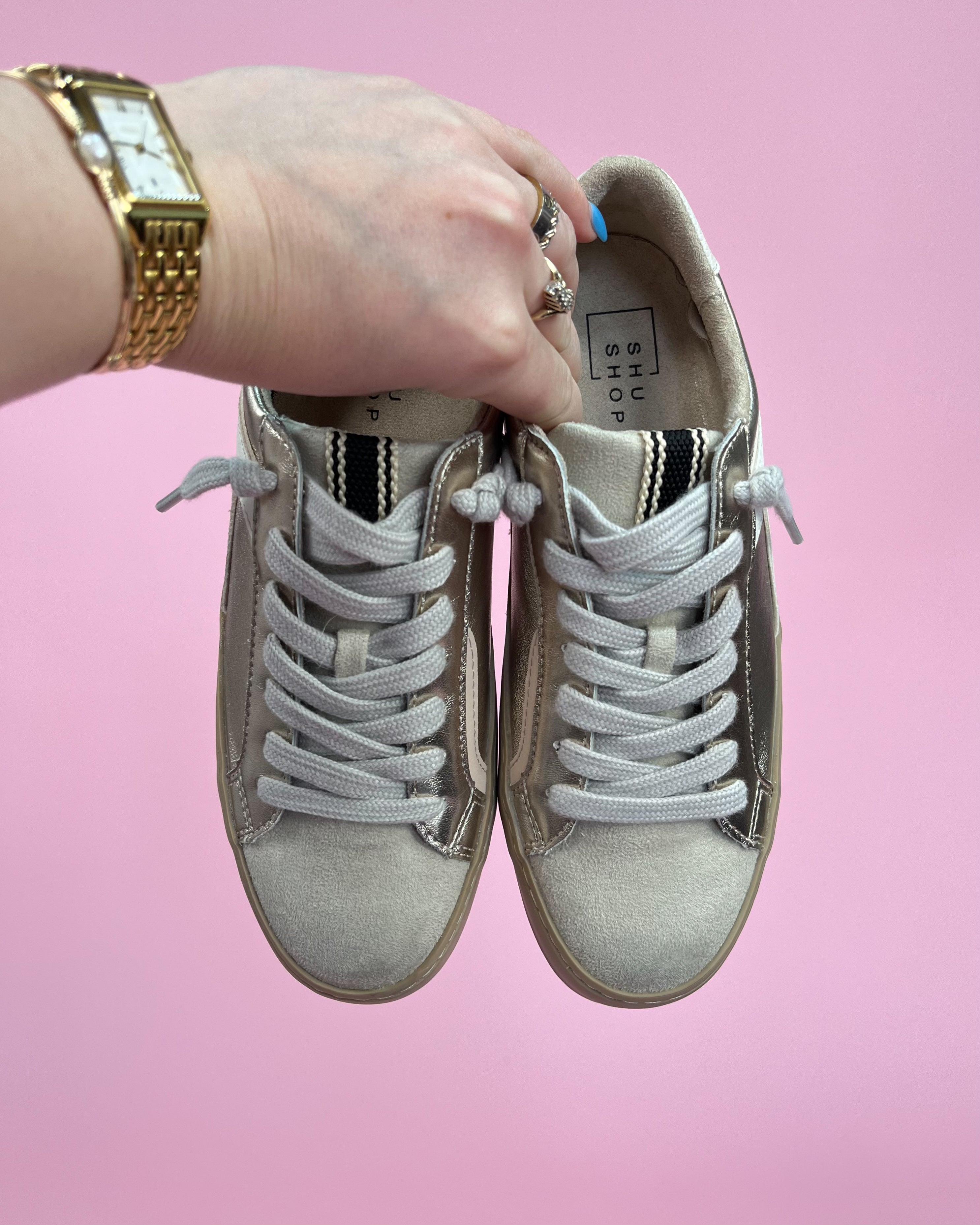 If you’re looking for that perfect everyday boutique sneaker that instantly makes even your most casual outfit feel elevated, Rebecca is it. ✨🤍 This gorgeous gold metallic sneaker is giving effortless cool-girl style with just the right amount of shine.