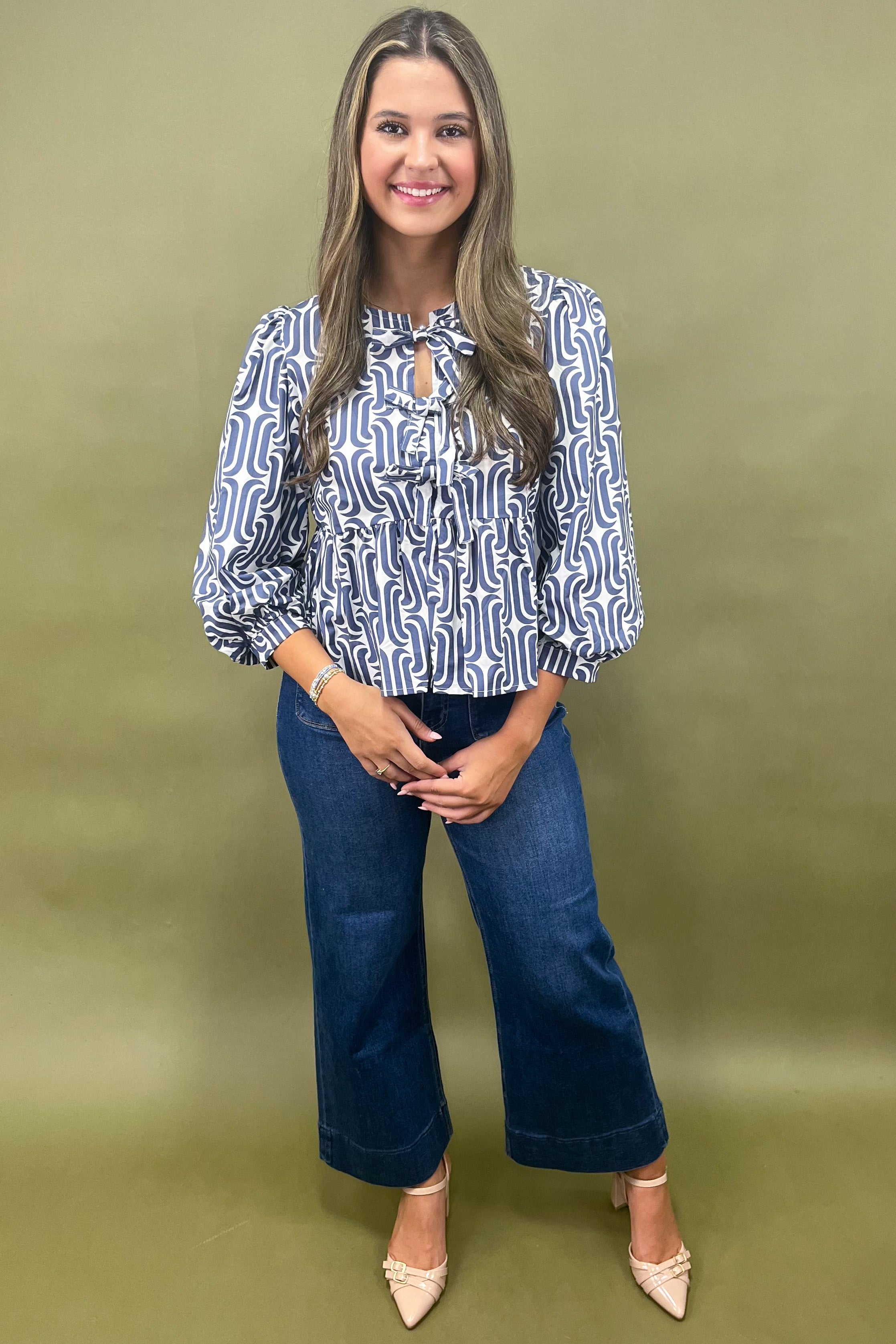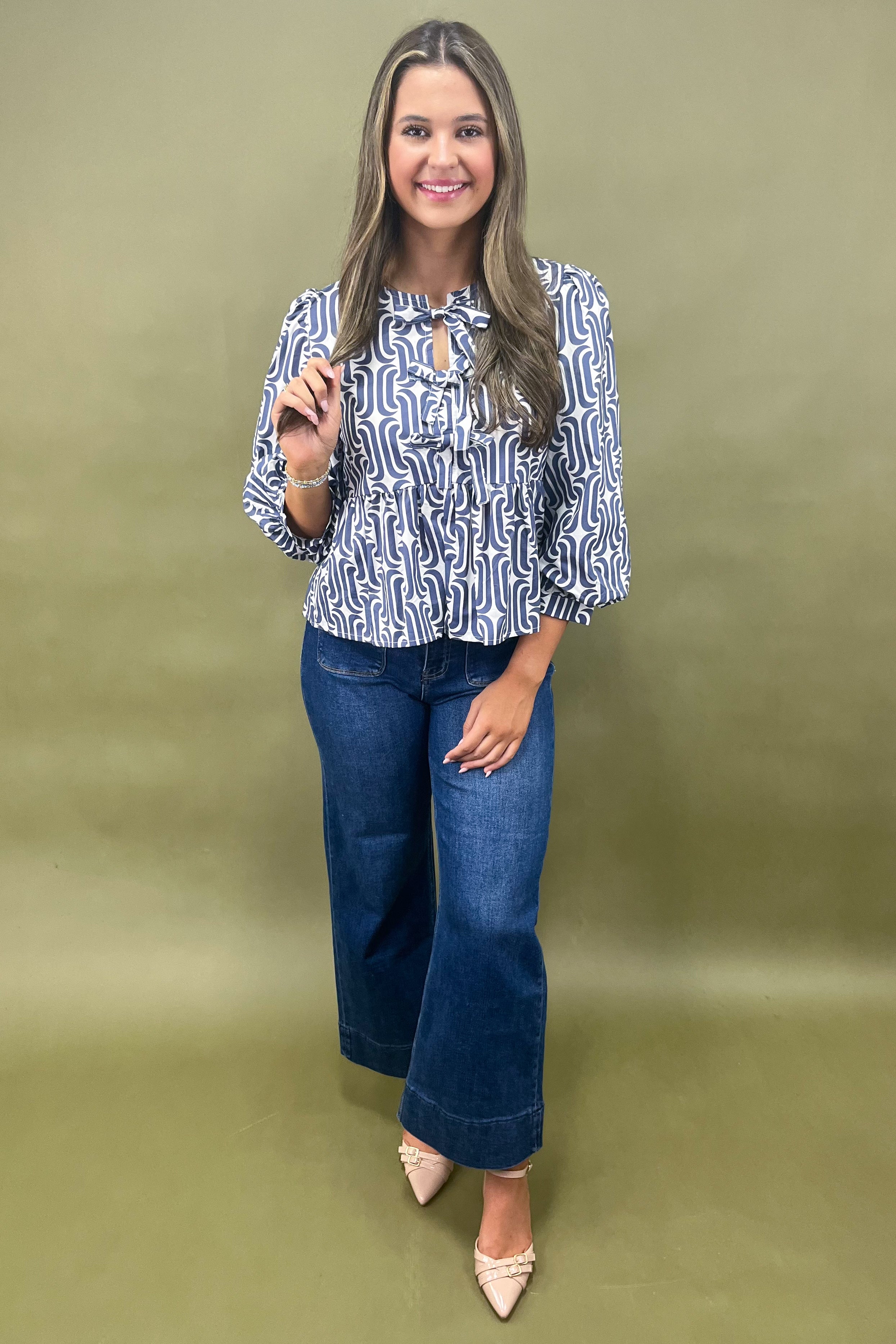 If fun prints and polished details are your love language, Retro Rhythm is calling your name. With her eye-catching navy + white geometric pattern and flirty tie-front detail, she’s bold, playful, and undeniably chic. The puffed sleeves add volume and personality, while the cinched waist keeps the silhouette flattering and feminine.