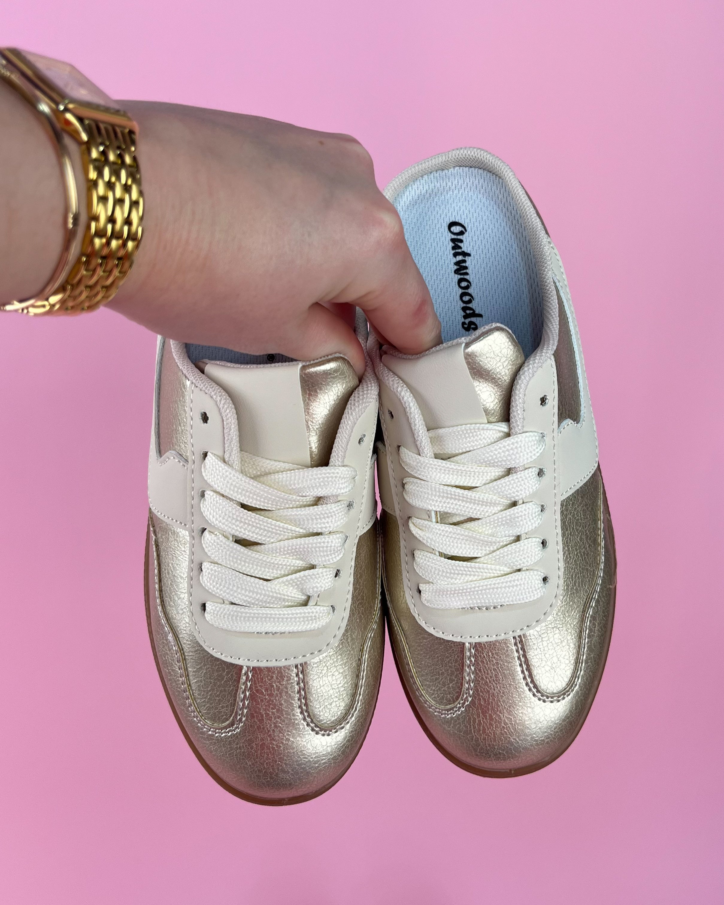 • Meet your new everyday statement sneaker — sporty, chic, and just the right amount of shine. This metallic beauty features a soft champagne-silver finish paired with crisp white accents for a clean, elevated look that still feels easy and wearable. The classic lace-up design keeps it timeless, while the gum sole adds that trendy boutique edge we love.