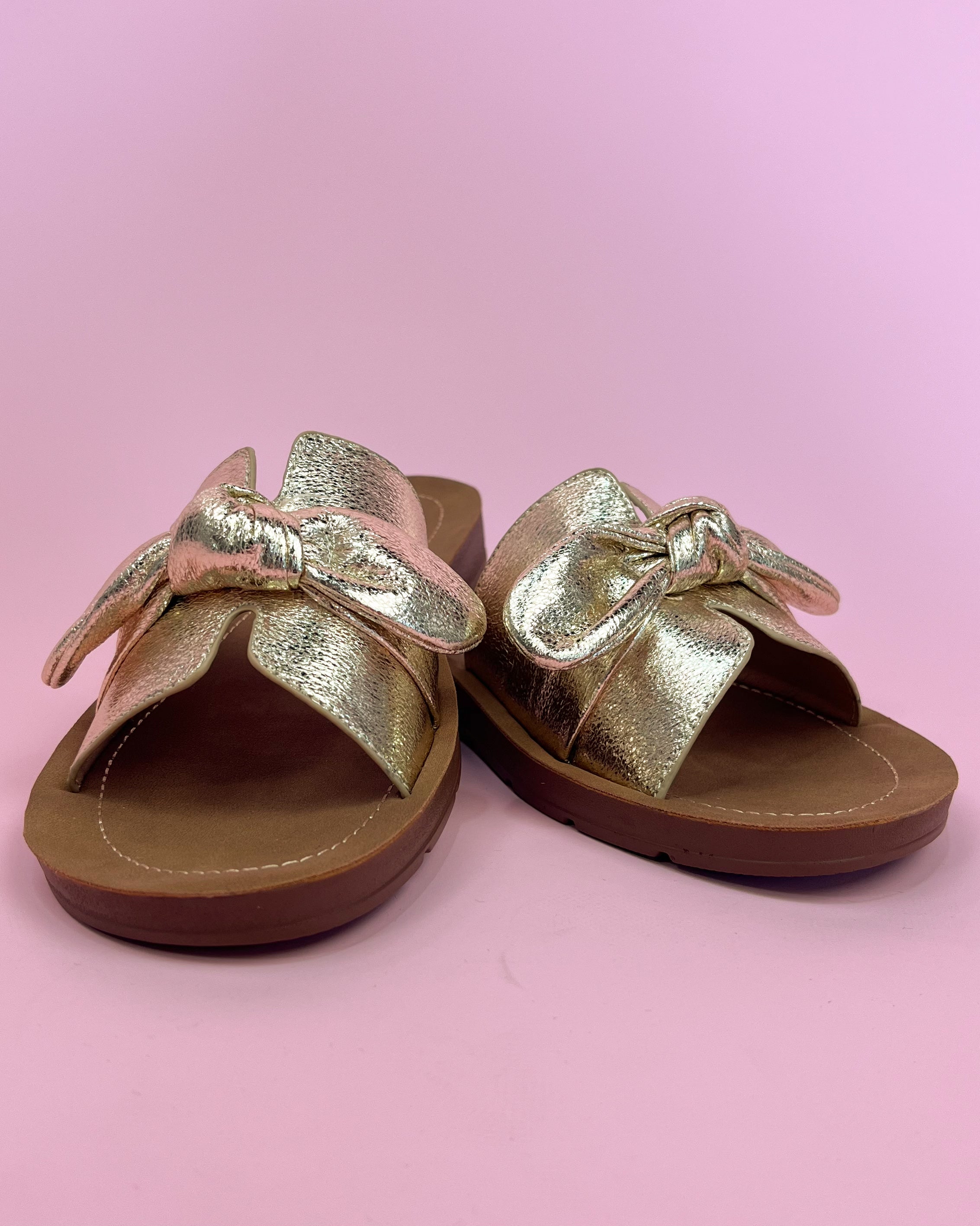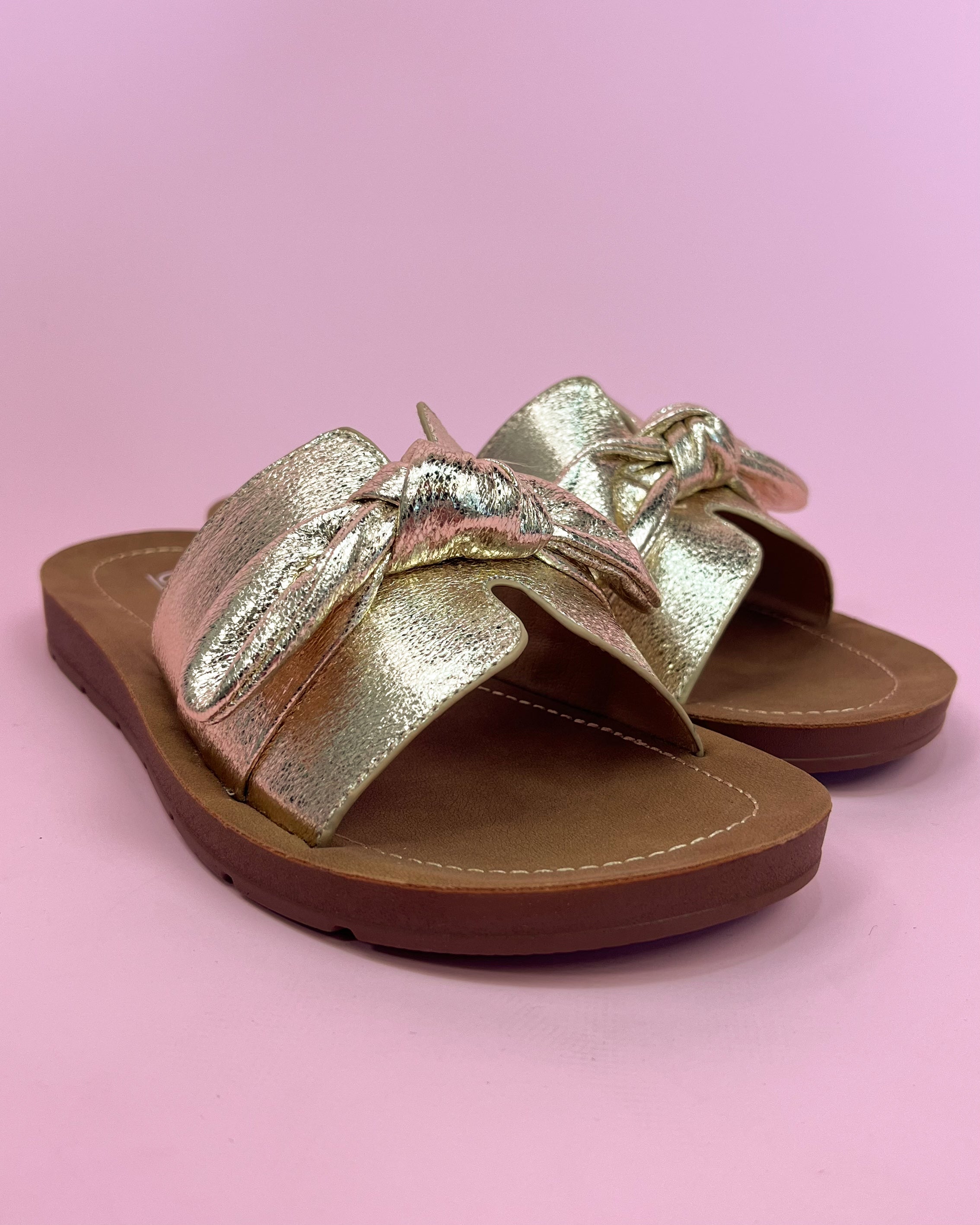 The soft gold metallic upper features a statement knot detail that feels feminine and modern without being over-the-top. Finished with a cushioned footbed and easy slide-on design, Vanessa is perfect for dressing up denim, pairing with summer dresses, or adding polish to casual looks. Comfortable, versatile, and boutique-perfect.