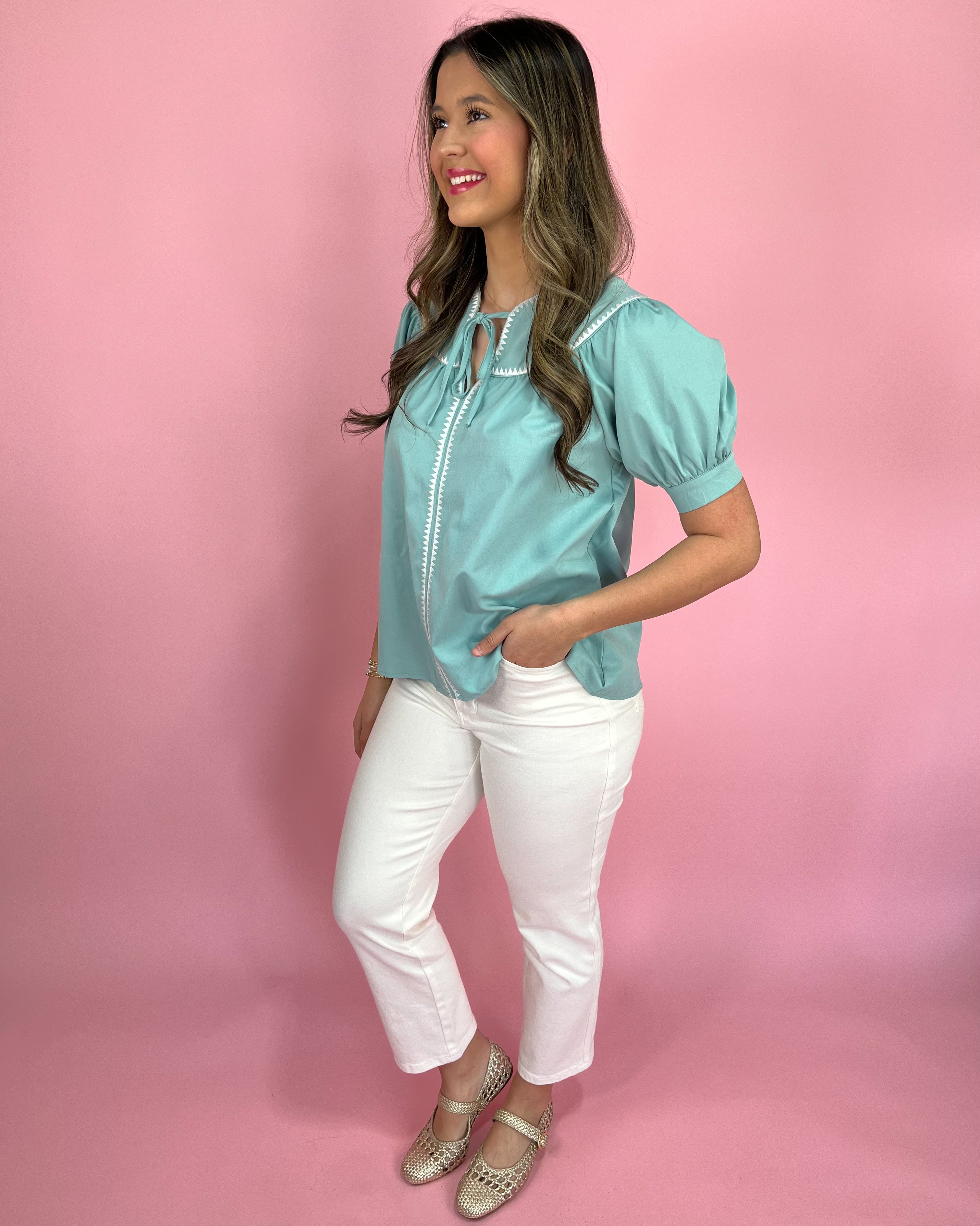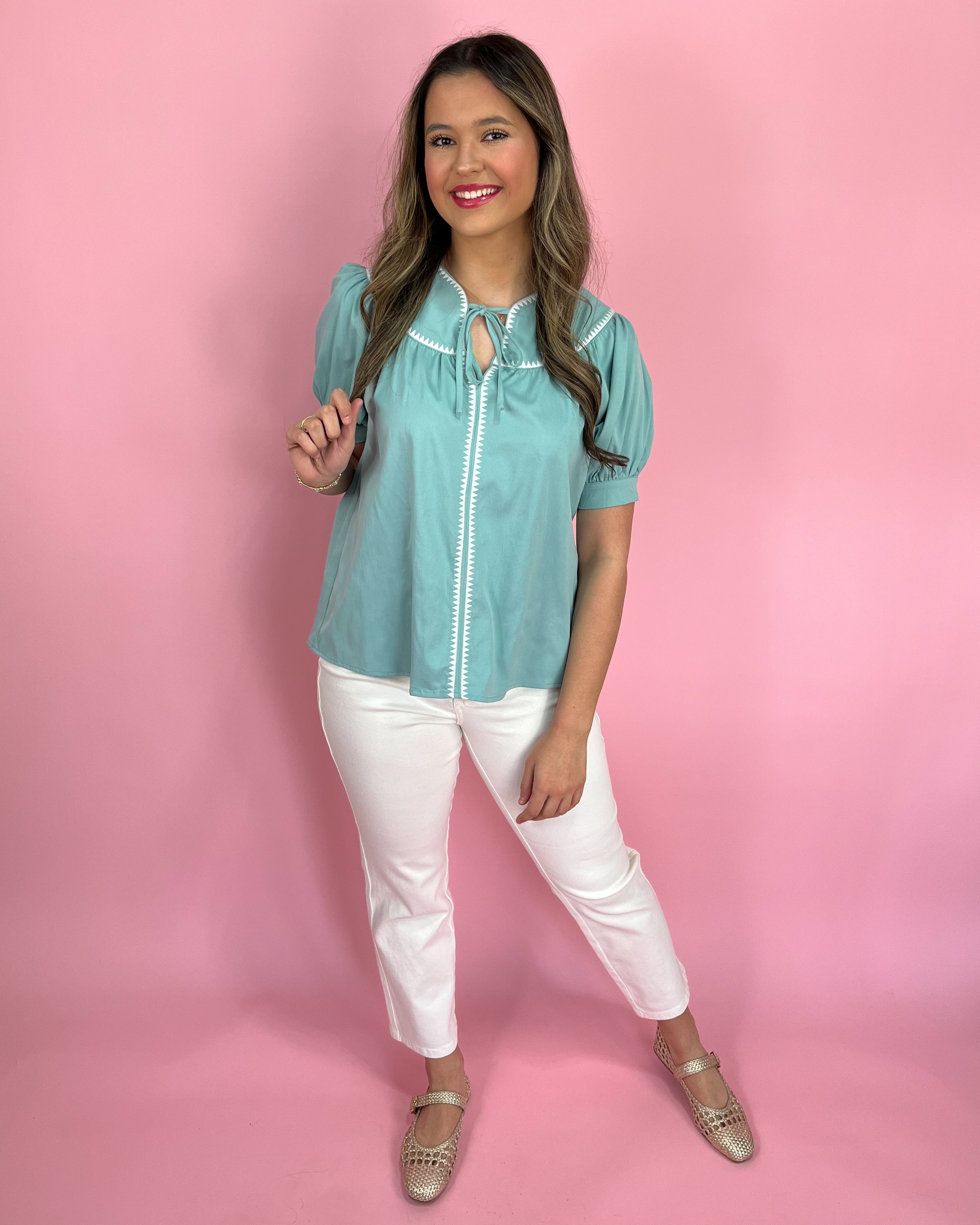 This top is giving soft, feminine charm with an easy everyday feel 💕 The airy sage-green hue paired with delicate white trim makes it feel fresh, polished, and effortlessly pretty ✨
