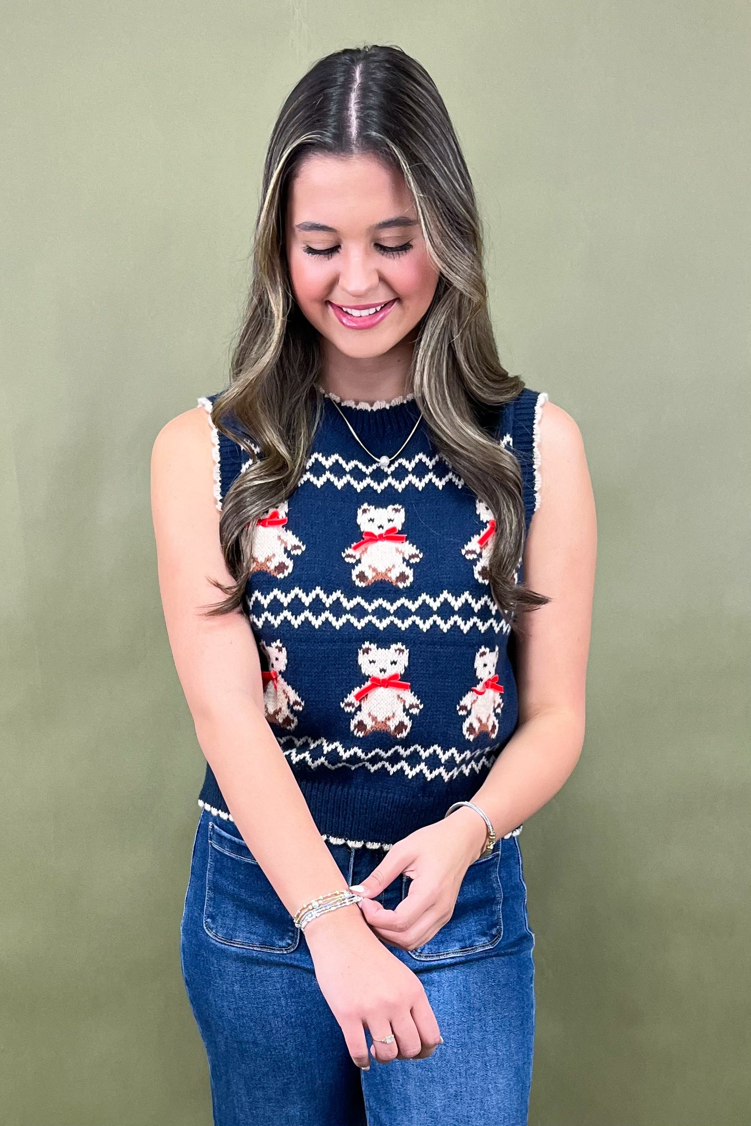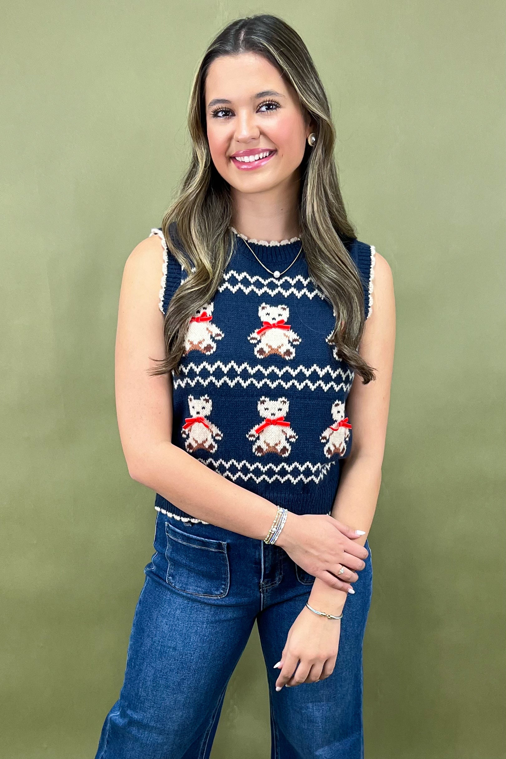 Designed in a classic navy knit with cream scalloped edges and an adorable teddy bear motif (each accented with a sweet red bow đ), this piece strikes the perfect balance between kitschy-cute and effortlessly chic. Itâs a nod to the 80s and 90s sweater vest revival â fun, nostalgic, and totally wearable today.